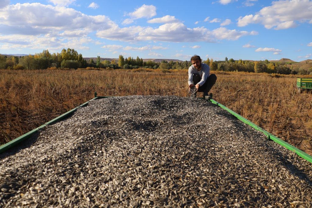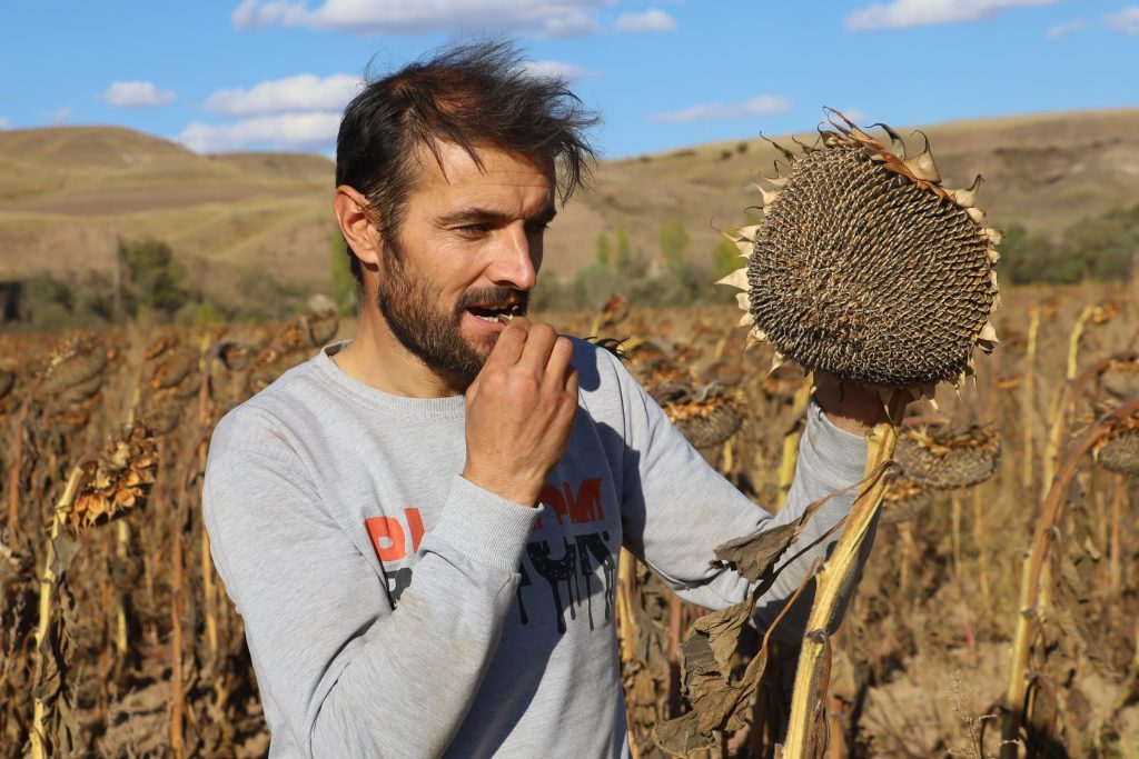 "Çekirdeğin dalında kurumaya bıraktık, o yüzden de biraz geç başladık. Zor bir süreçti bizim için. Beklediğimiz verimi de alıyoruz. Şu anda çekirdeğin kalitesi ve verimi çok güzel. Bizde hijyen kurallarına çok önem veriyoruz. Kurutma işlemini yerde karıştırma işlemleri yapmayalım diye dalında kurumasını bekledik. Dönümüne 300 kilogram rekolte bekliyoruz. 620 dönümlük bir alanda üretim yaptık. Vahşi sulama dediğimiz sulama yöntemleri kullanmadık. Damlama sulama yöntemi ile sulama yaptık. Çekirdek tüketiciye karşı iyi fiyat ediyor ama çiftçiye karşı değil. Herkes iyi bir fiyat beklemesin, kalitesine göre fiyat biçilsin. Kaliteli çekirdek iyi para yapsın, kalitesiz çekirdek de çok pahalıya satılmasın. Bu sene hasat benim yüzümü güldürdü. Ürünü yetiştirme aşamasında çok yıprandık. İnsanlar küçücük bahçelerinde damlama sulama yaparken biz 620 dönümlük tarlanın 400 dönümüne damlama sulama sistemi kurduk. Bu boruları sermesi, toplaması, filtrelerinin değiştirilmesi inanılmaz bir zorluk çektik. 3 kişinin yapabileceği bir iş değildi ancak özel hayatımızdan ve kendimizden çok fedakarlık verdik"