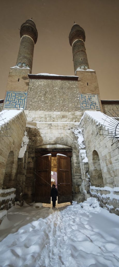 Sivas’ta yoğun kar yağışı Tarihi Kent Meydanı’nı beyaza bürüdü, 8 asırlık eserler kartpostallık manzaralar sundu.