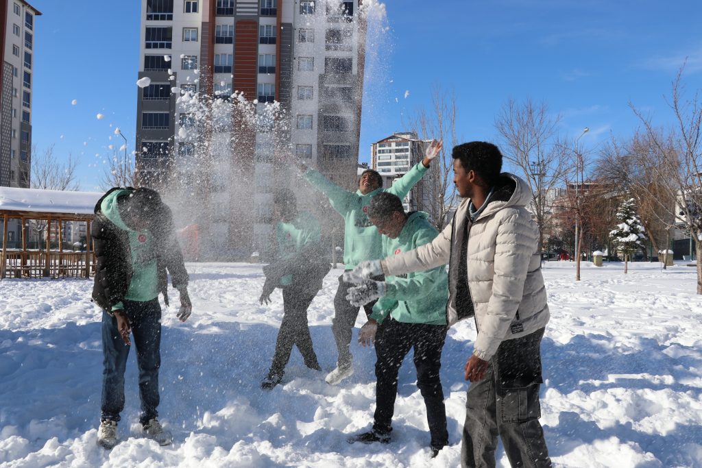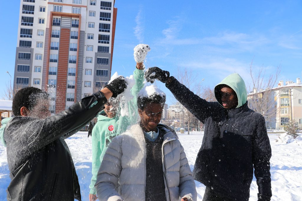 Sivas’ta eğitim gören Afrikalı öğrenciler, hayatlarında ilk kez karla tanıştı. Kardan adam, kartopu ve büyük bir mutluluk…