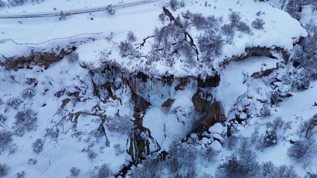 Sivas Doğanşar’daki Dipsizgöl donmadı, şelalede 5 metreyi bulan buz sarkıtları oluştu. Kış manzarası havadan görüntülendi.